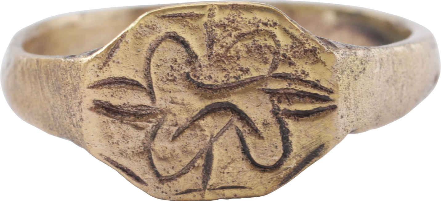 Byzantine, (the remnants of the Roman Empire) of Christian type. Gilt bronze, rare size 12 with 2.4mm rounded face band flaring to the shoulders. Octagonal bezel cut with borders enclosing a floral motif. The figure is similar to and likely derived from the earlier representations of the Star of Bethlehem. Excellent preservation with the details crisp. The 24karat gold surface restored and gift boxed with certificate of authenticity.