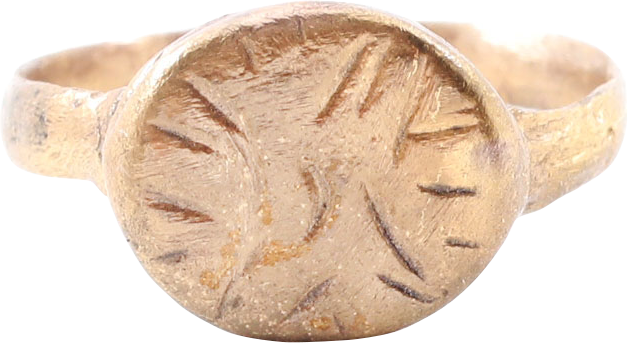 Gilt bronze with 2.9 band flaring to the shoulders. Raised oval bezel engraved with a four-point star with radials in the quadrants, representing the Star of Bethlehem. Professionally refurbished with the 24karat gold surface restored. Jewelry gift boxed with certificate of authenticity.