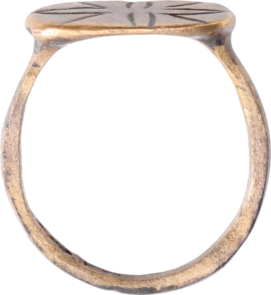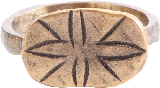 Iconic type popular in Northern Europe in the 15th-17th century. See Ancient Rings, Pollio, p.30. Gilt bronze, size 7 1/4 with 2.5mm rounded face band. Oval bezel with a floral quatrefoil representing the Star of Bethlehem, superimposed on a saltire (St. Andrew’s cross). Professionally refurbished with the 24karat gold surface restored. Gift boxed with a certificate of authenticity.