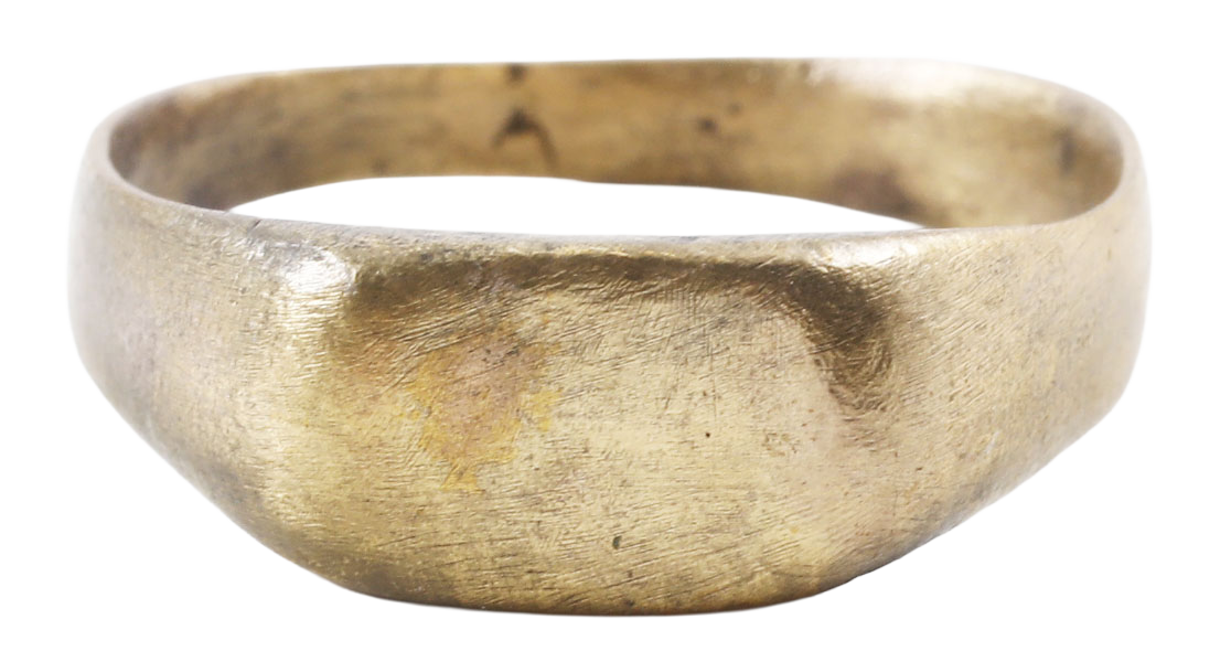 Gilt bronze, size 10 with 2.8mm slightly rounded face band flaring to the shoulders and rounded pyramidal bezel, a carry over from the high fashion of the 14th century. Dating to the Christian era and possibly the ring of a Pilgrim. Professionally refurbished for modern wear with the 24karat gold overlay restored. Gift boxed with a certificate of authenticity.