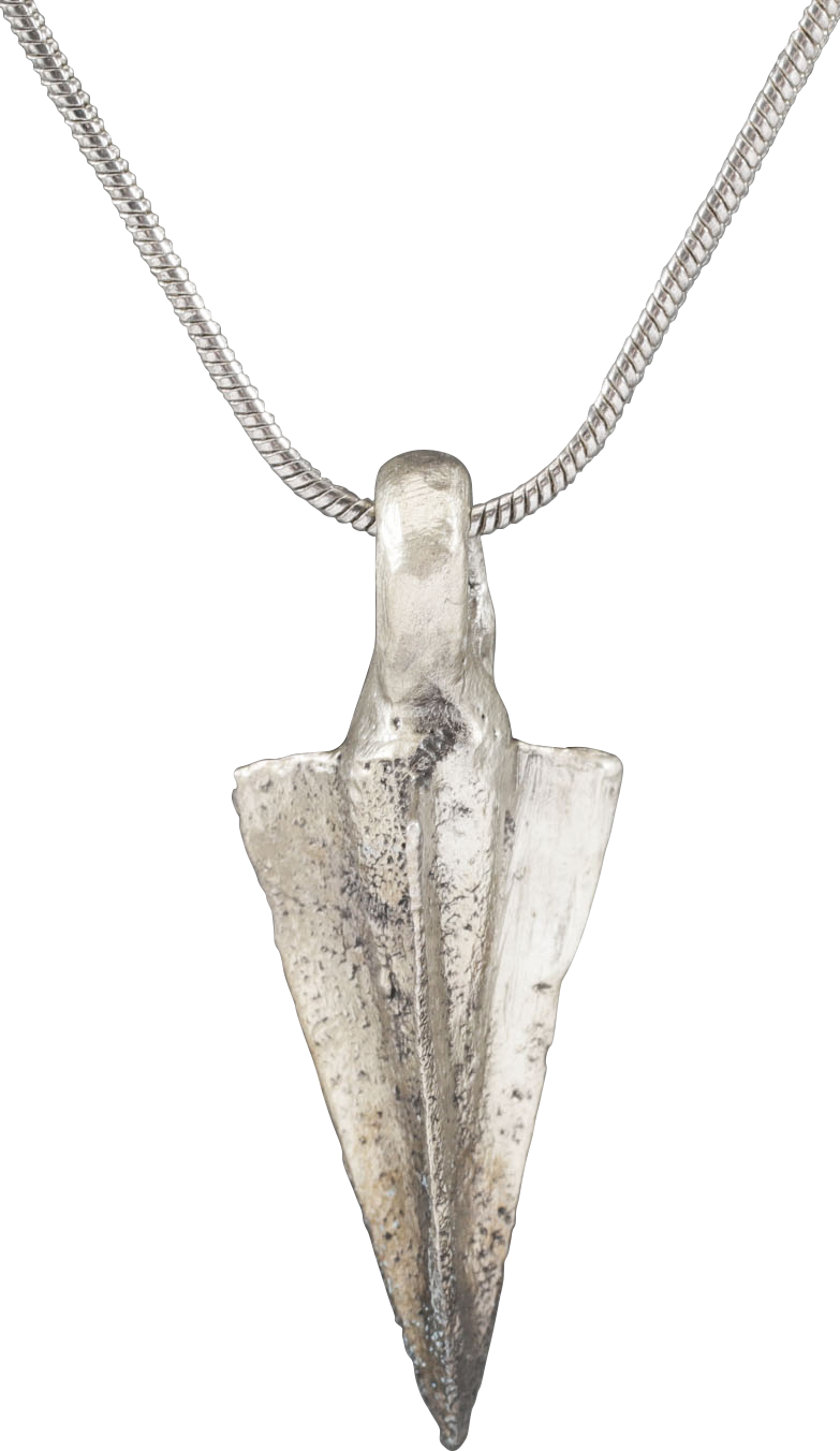 Silvered bronze, just under 1” (0.96”) length plus the suspension loop. Conical socket with fine three triangular veins with edges sharpened. The ancient Parthian empire, was centered in ancient Persia (Iran). It grew to power under Arsaces’ military conquests and experienced cultural enrichment from its keystone location on the Silk Road. Professionally refurbished with a silver surface and mounted on an 18” silver neck chain for modern wear. Gift boxed with certificate of authenticity.