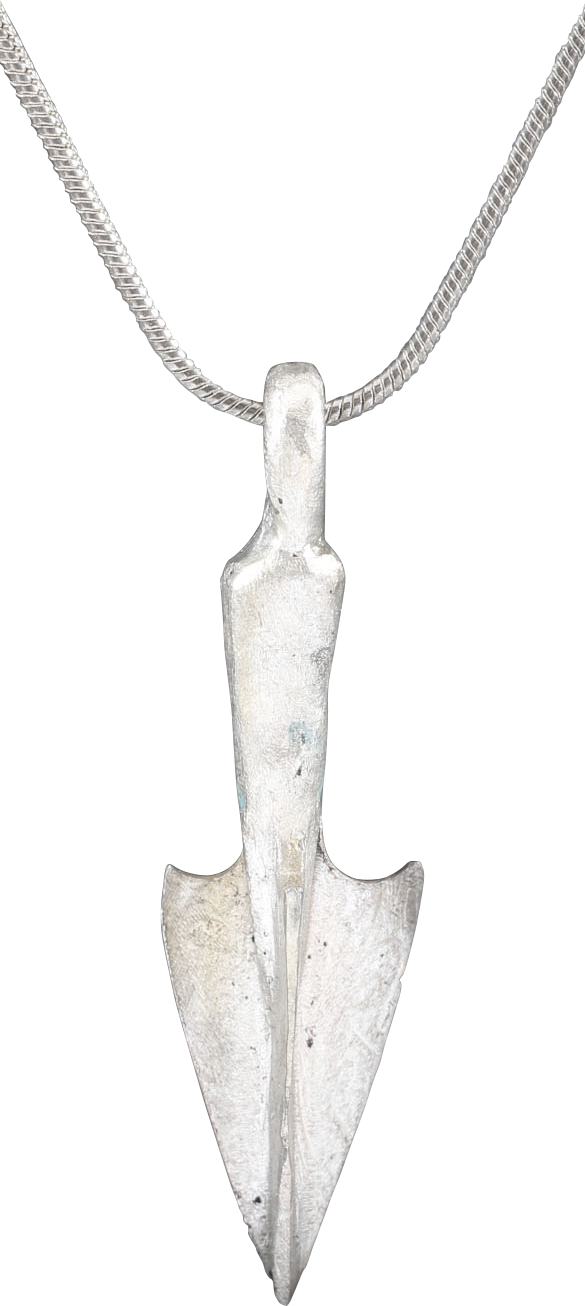 Silvered bronze, just under 1 3/8” (1.33”) length plus the suspension loop. Conical socket with fine three triangular veins with cusped barbs. The ancient Parthian empire, was centered in ancient Persia (Iran). It grew to power under Arsaces’ military conquests and experienced cultural enrichment from its keystone location on the Silk Road. Professionally refurbished with a silver surface and mounted on an 18” silver neck chain for modern wear. Gift boxed with certificate of authenticity.