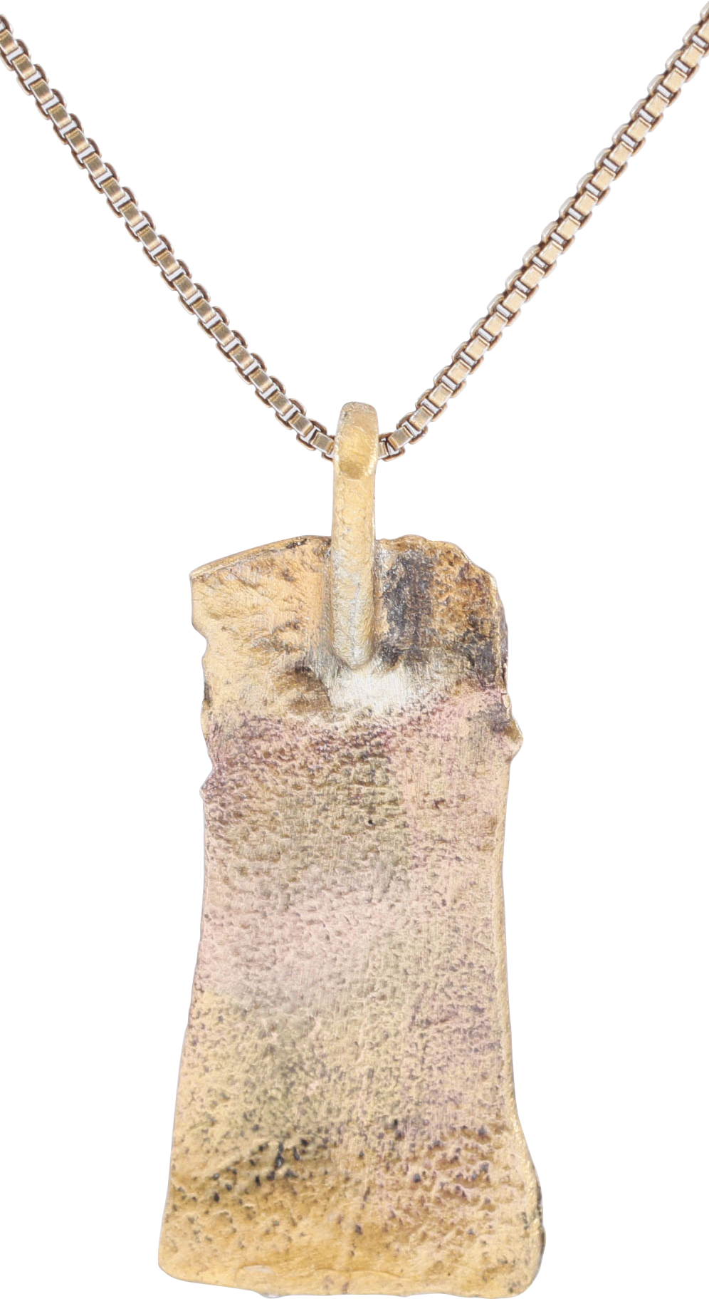 10th-11th century AD. Vikings were highly skilled metallurgists, and as a result, breaking metal had supernatural significance for them. Breaking ringjarn (iron rings) as shown on the Larbro Stone in Gotland Sweden, was thought to destroy the spirits of enemies. Similarly, Viking weapons and accouterments were broken for burial with their owners. This is a piece of a fine Viking warrior’s bronze bracelet, ritually broken. It is about 3/8” x 1” and hand-decorated with the lower portion of an anthropomorphic figure. Such figures are rare in Viking art and iconography. It is lightly worn from use and burial and has been professionally refurbished with a 24karat gold overlay and mounted to a gilt Sterling silver 18" neck chain for modern wear. It comes with a certification of authenticity and is jewelry gift boxed.