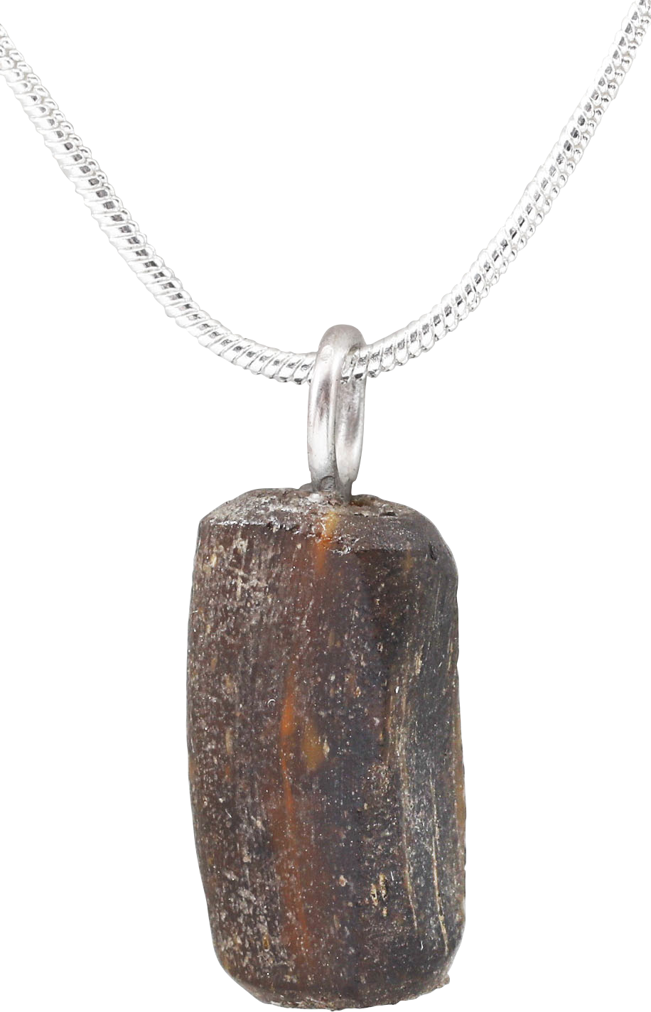 A short segment of a Roman woman’s glass bracelet of the late Imperial period. About ¾” length of dark amber hand wound glass. Suspended from an 18" Sterling silver neck chain for modern wear. Gift boxed with certificate of authenticity.