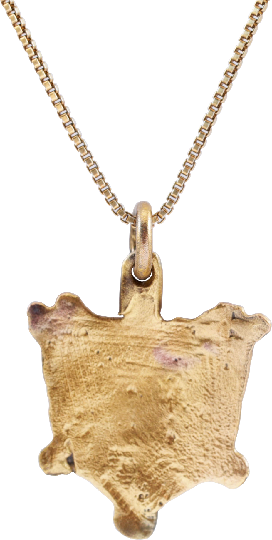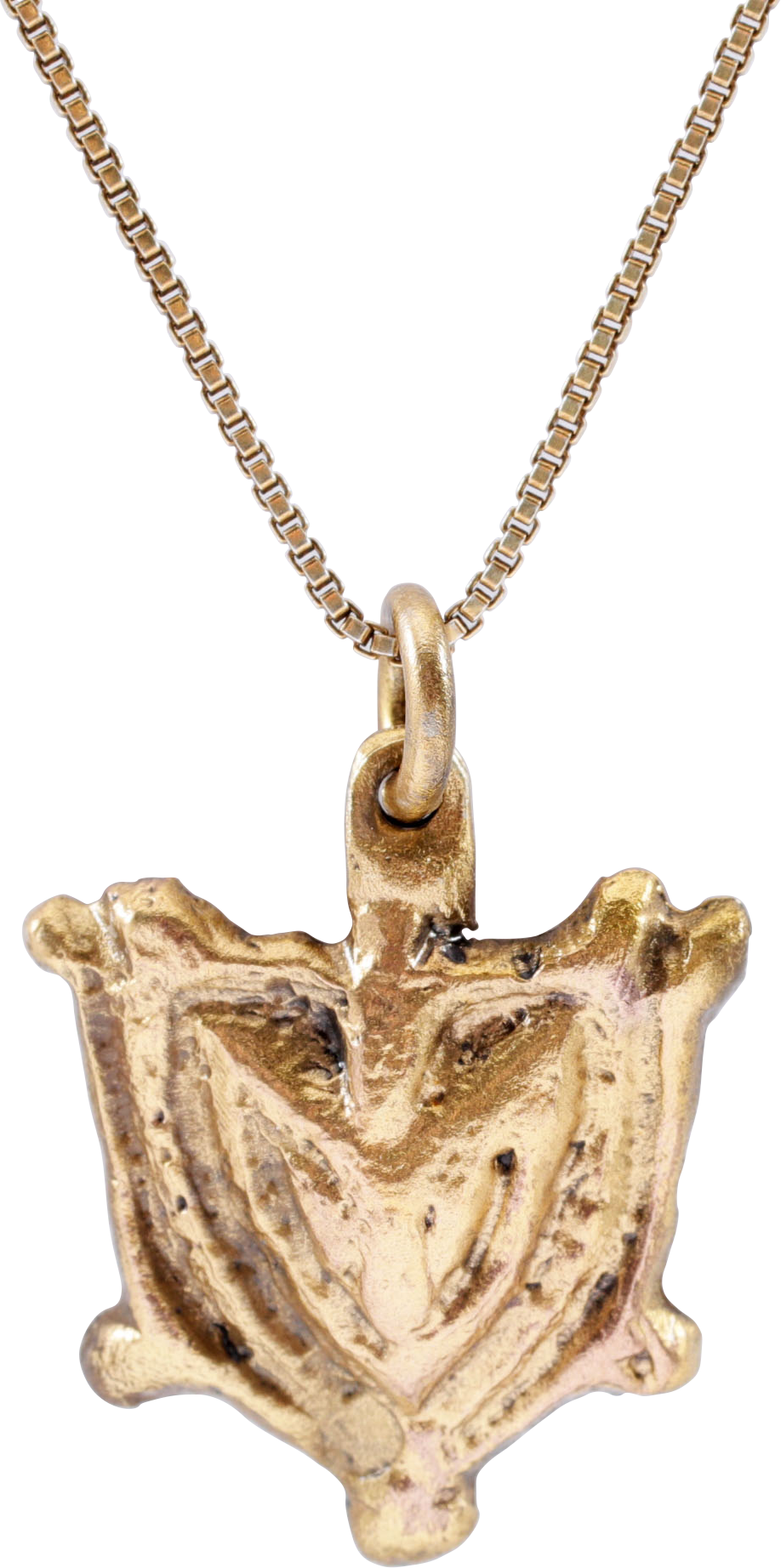 Directly based on the classic heart form. About 7/8" (0.87”) total height. Shield shaped with crenulated border enclosing a arrowhead shape in high relief. That figure replaces the earlier examples with a central heart. otherwise indistinguishable from the earlier Viking examples on which it is based. Flared edges with quartered nubs. Made by the open face mold technique. Professionally refurbished with the 24karat gold surface restored on an 18” gilt sterling silver neck chain for modern wear. Gift boxed with certificate of authenticity.