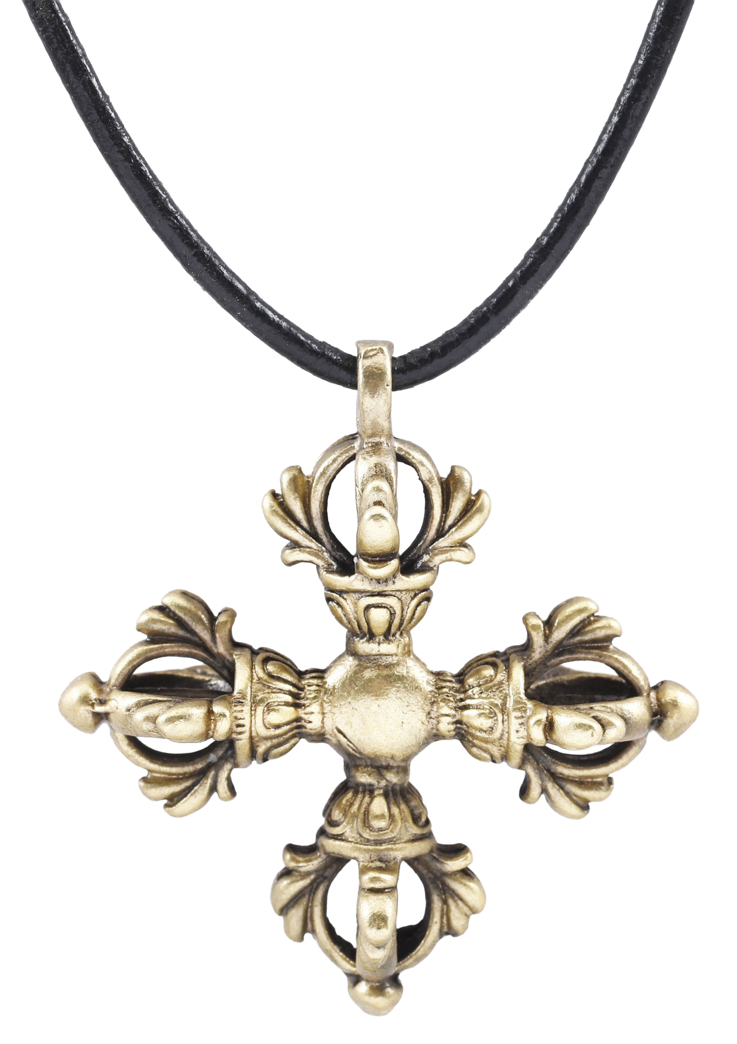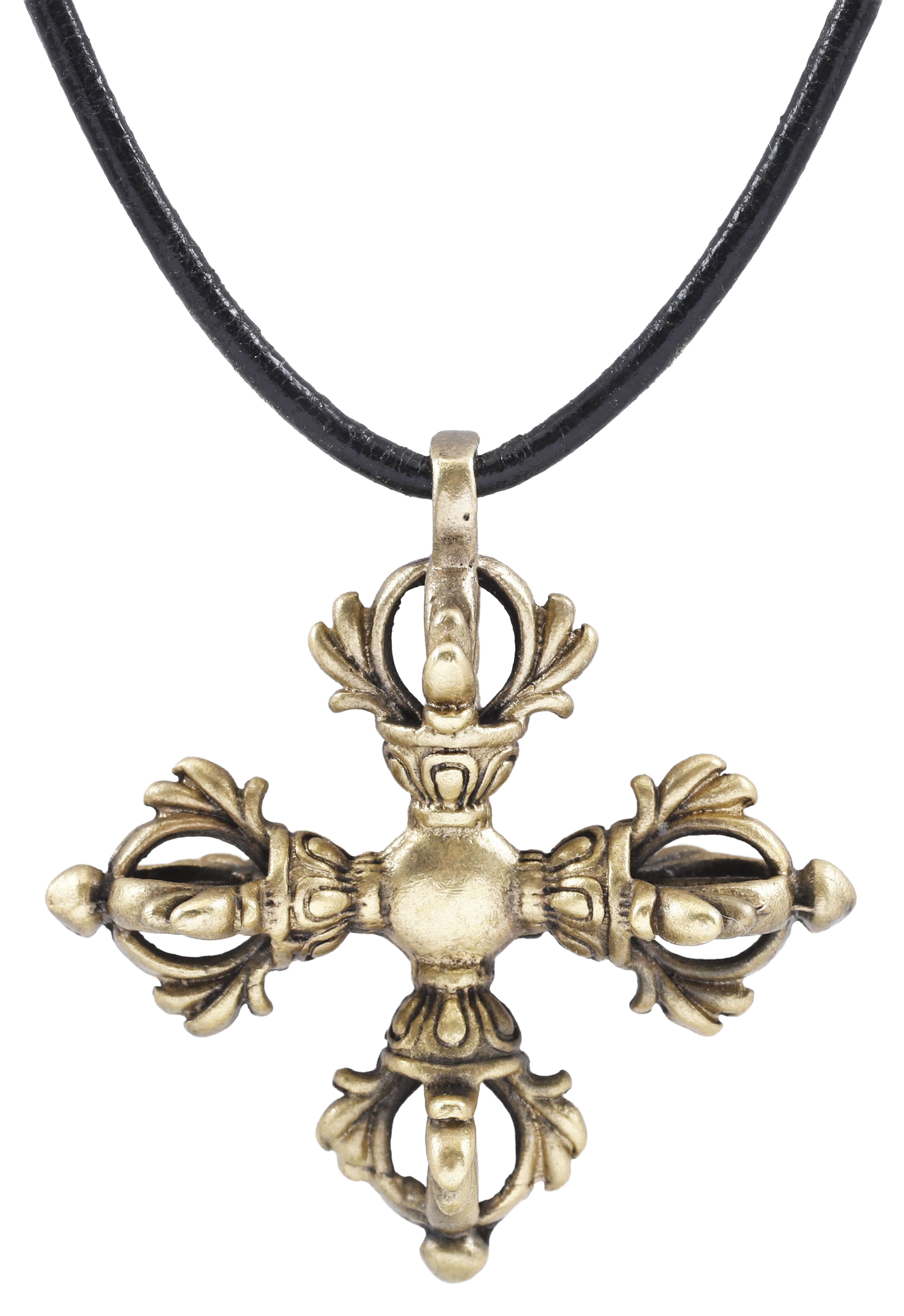 Gilt bronze, just over 1 ½” (1.52” height plus the loop). Modeled as crossed vajras and finely detailed. Mounted on an 18” gilt silver mounted polished leather neck cord for modern wear. Possibly made for a refugee driven from Tibet in the 1950’s by the Communist Chinese takeover.