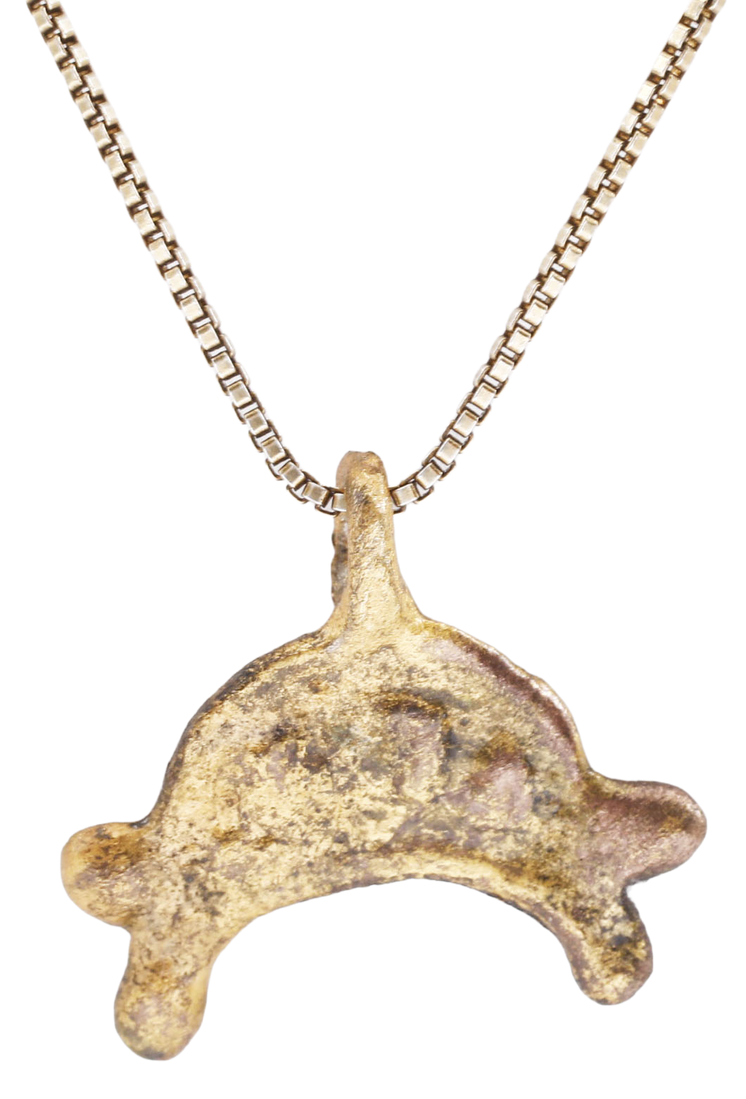 Slightly over 5/8 “(0.66”) height including the suspension loop. Bronze, cast, and chased in minute detail as the double raised edge crescent moon with baluster tips representing Sol the sun and Mani the moon. Raised edge crescent with three figures in the field, now worn and unidentifiable. Undoubtedly of astrological significance, now lost. Viking worship involved the heavenly bodies on which they relied for guidance when sailing. Fine quality. Excellent condition with the 24karat gold overlay restored and mounted on an 18” modern gilt silver neck chain for contemporary wear. Jewelry gift boxed with a certificate of authenticity.