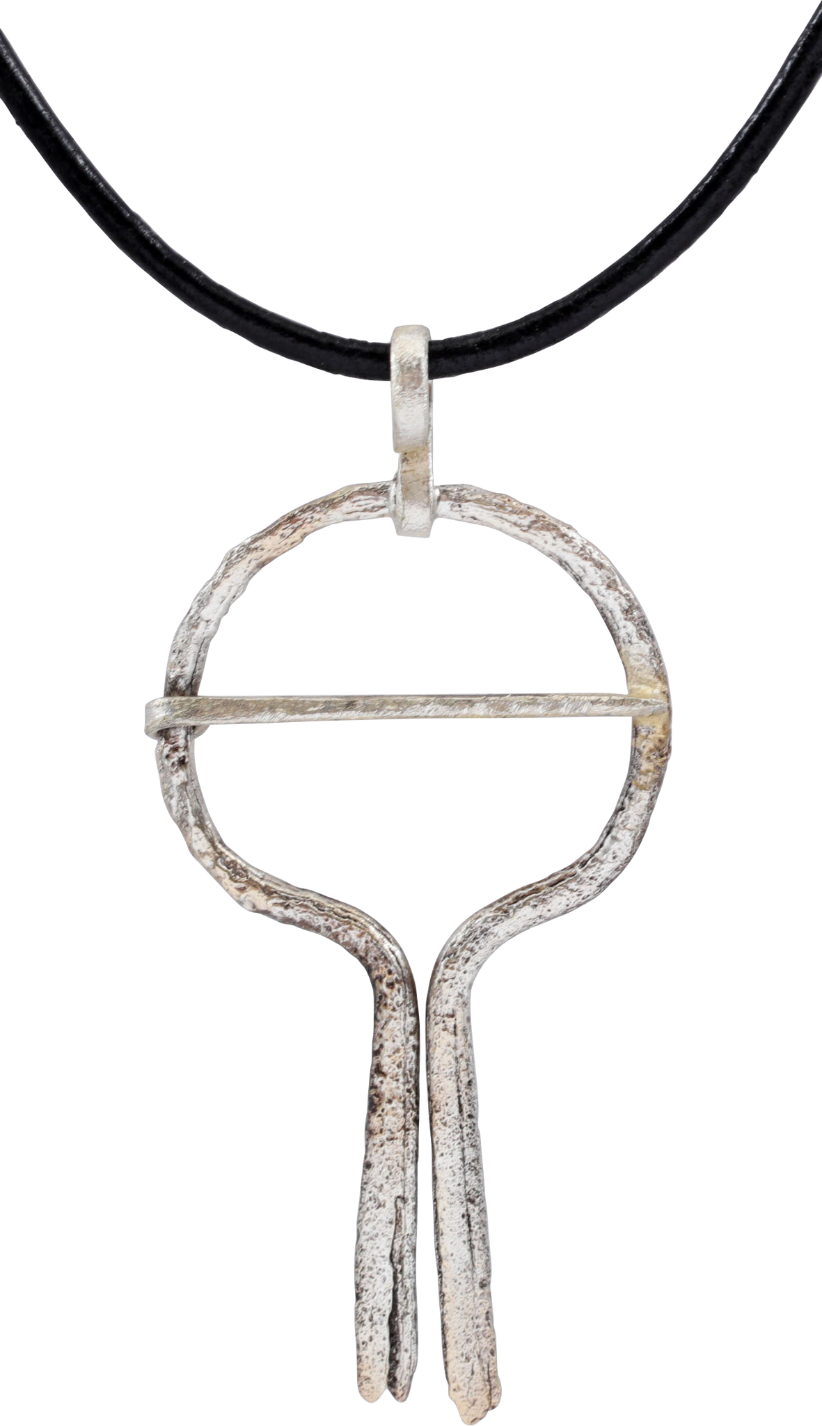 Silvered bronze of substantial proportions with circular top, over 1 1/8” (1.13) width with cross pin and long, tapered, terminals. When fastened to the jerkin, these small metal brooches provided a measure of protection against sword cuts and, in fact, were a form of armor. In addition to being more decorative, examples of this form provided added protection with the trailing tails. See current Public Television programming for documentation of these in action. As protectors, they also held spiritual significance for the warrior. Professionally refurbished with the pure silver overlay restored and suspended from an 18” Sterling silver mounted polished leather neck cord. Gift boxed with certificate of authenticity.