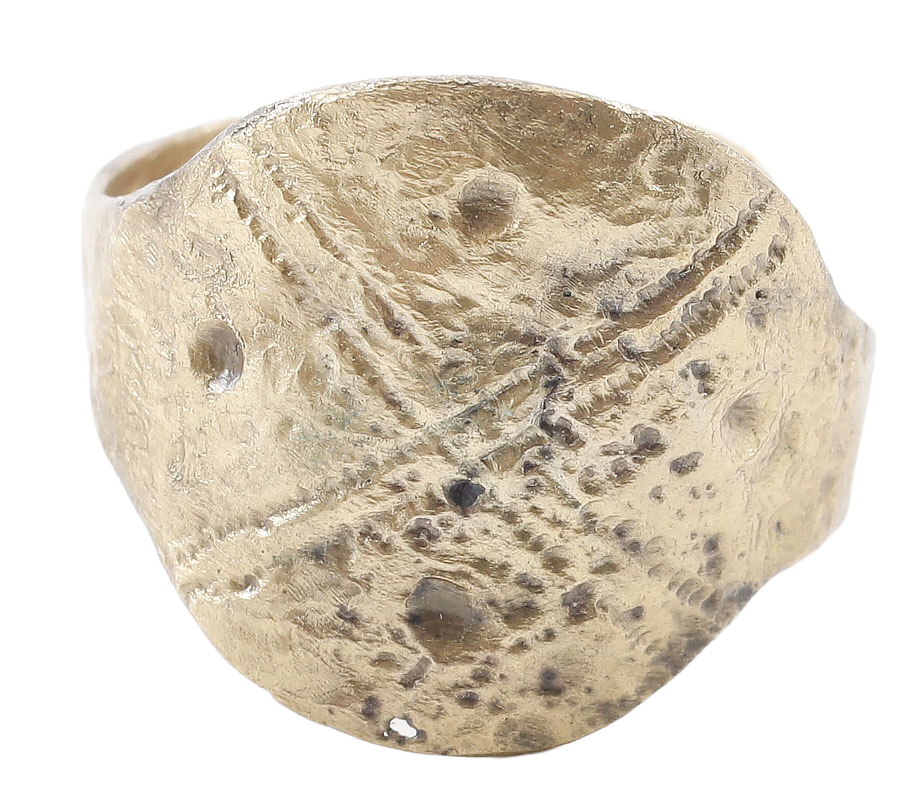 Iconic form with doubled split band flaring to the shoulders and flanking shield shaped bezel decorated with a saltire. Each beam of double stipple lines. The interior spaced with centered circles. Surface textured from burial. Professionally refurbished with the 24karat gold surface restored for modern wear. Gift boxed with certificate of authenticity.