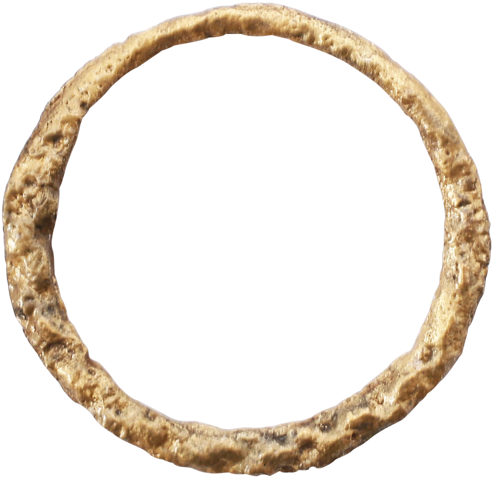 Gilt bronze, just under 1” diameter, ring size 10. Circular section. The upper half as a spiral or roped, tapering from the center. These were worn in the hair, particularly around the ears. For Vikings, beautiful hair was a sign of wealth and status. There is some indication that they were also worn on the finger, perhaps a regional practice and likely, considering that Vikings occupied thousands of square miles for over 300 years. Professionally refurbished with the 24karat gold surface restored.