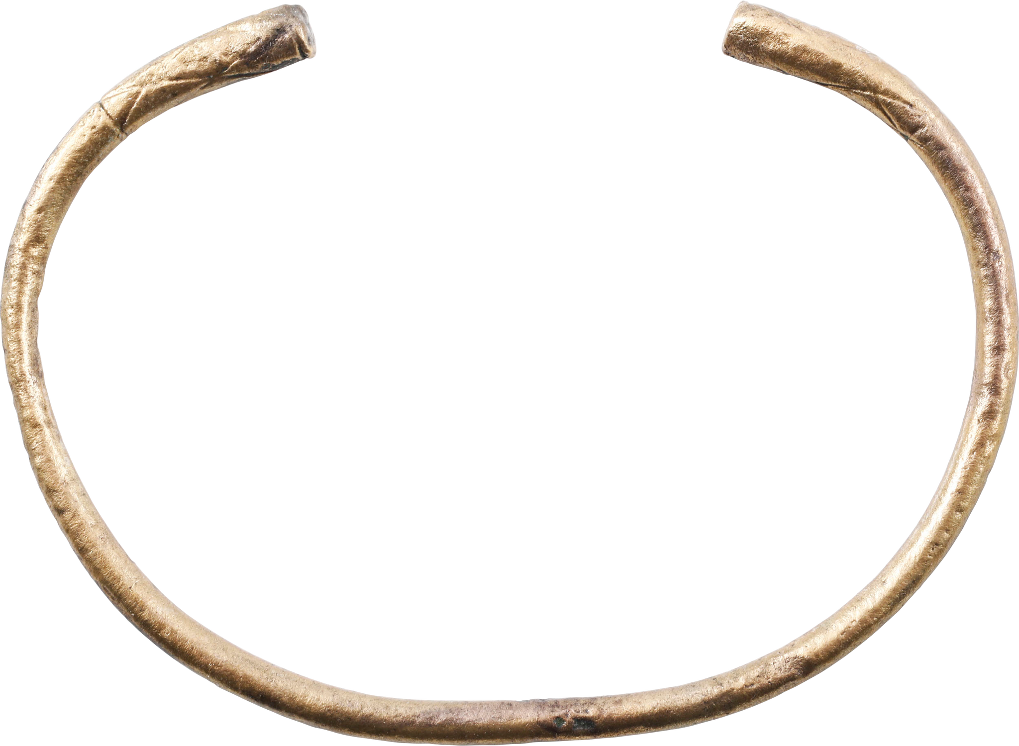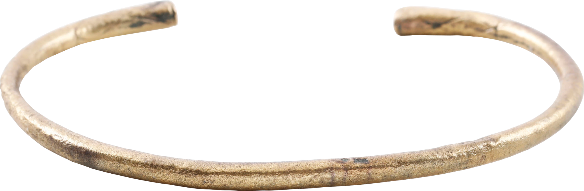 2.47” inside dimension and 3.28" outside. Circular section, tapering from the middle to the expanded terminals which are decorated with elongated diamond incised motif. Suitable for wear on the wrist or forearm and possibly made for a Viking woman warrior. Surface degradation from burial. Professionally refurbished with the 24karat gold overlay restored for contemporary wear. Gift boxed with certificate of authenticity.