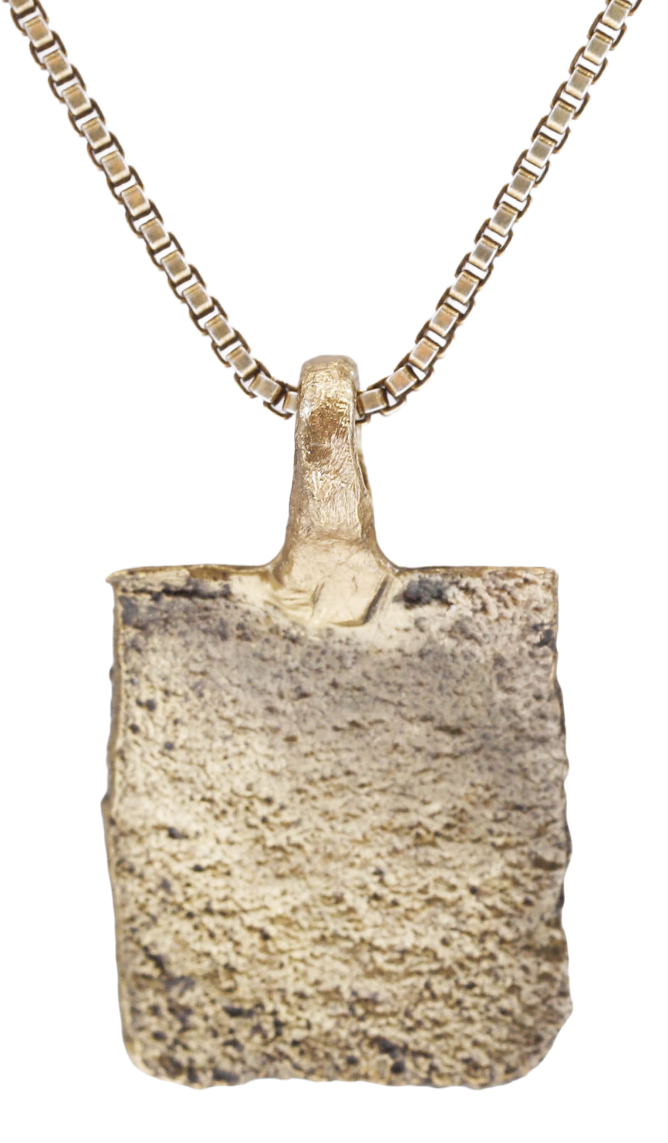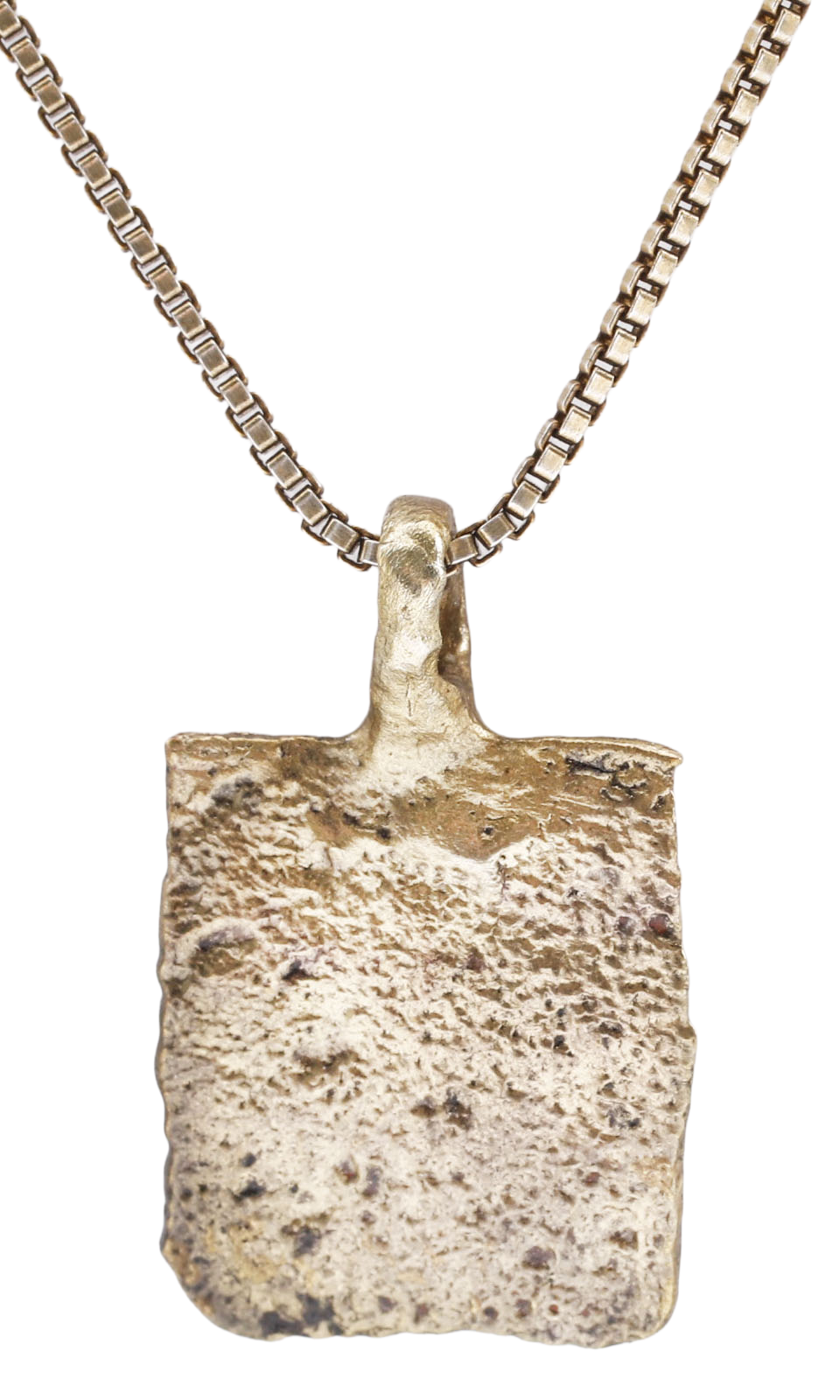 10th-11th century AD. For Vikings, breaking metal had supernatural significance. Breaking ringjarn (iron rings) as shown on the Larbro Stone, was thought to destroy the spirits of enemies. Viking weapons and accouterments were broken for burial with their owners. This is the broken end of a Viking woman warrior's bronze bracelet. It is about ½” square, (0.45” X 0.51”) with just remnants of punch decoration. The surface is heavily textured from burial. It was handcrafted by a Viking artisan 1000 years ago! For a very similar bracelet fragment dated to 879-880AD, see https://demo-ashmolean.web.ox.ac.uk/watlington-hoard. The Watlington Viking Hoard, Ashmolian Museum, Oxford was discovered in 2015. Watlington is in south Oxfordshire, about midway between Oxford and Heathrow Airport. It has been professionally refurbished with the 24karat gold overlay restored and mounted to an 18” gilt Sterling silver neck chain for modern wear. It comes with certification of authenticity, and gift boxed.