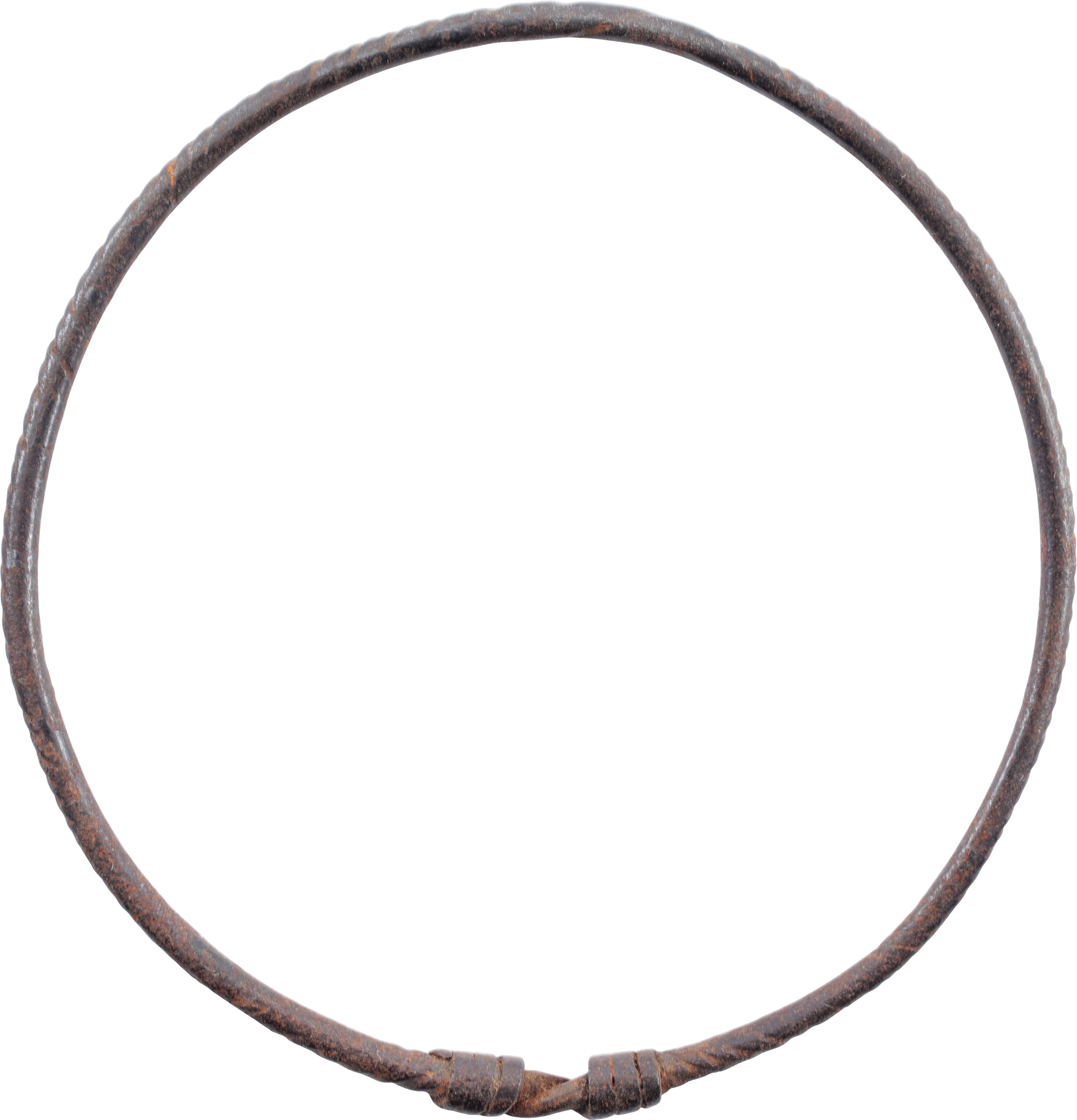 Iron, so finely forged in a tight spiral that the effect is a near smooth surface. The ends with double twisted knots. 2 1/2” (2.52”) inside and wearable. Used by shamans (herbalists) for healing. Iron was considered to have supernatural powers and iron smiths were feared outcasts.